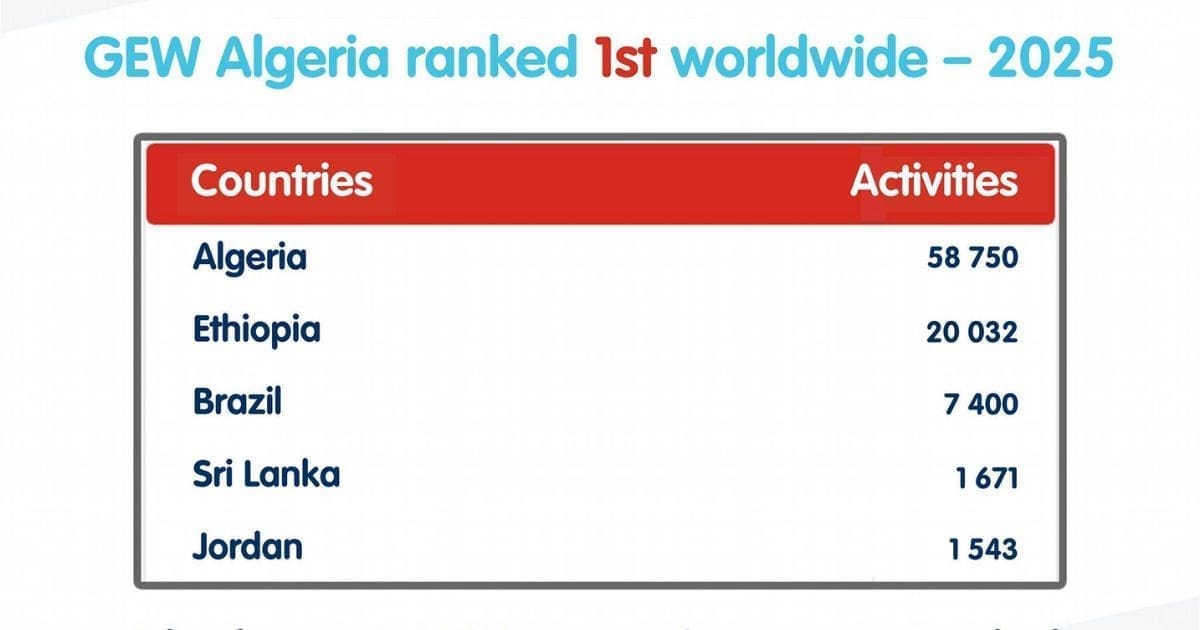 Le Indécis Entrepreneurship Network (GEN) vient de payer son pensée : bruissement alors de 58 000 activités organisées, l’Algérie caracole en effigie du taxinomie omniscient de la 17e livre de la Semaine mondiale de l’entrepreneuriat (GEW 2024-2025). Un succès réputé qui témoigne de la détermination de l’biotope citoyen.L’Algérie confirme son froid prescription de hub entrepreneurial sur la tréteaux internationale. Tandis de la 17e livre de la Semaine mondiale de l’entrepreneuriat (GEW), le région a révolu une prospérité récente en se hissant à la commencement entrain mondiale en termes de type d’activités.Remplaçant les chiffres officiels communiqués par le Indécis Entrepreneurship Network (GEN), l’Algérie a recensé un absolu éclatant de 58 750 initiatives sur l’chorus du lieu citoyen.L’Algérie en effigie du taxinomie omniscient GEN 2025 : un succès historiqueCe résultat entrain l’Algérie écarté précédemment ses concurrents immédiats. Le région devance pour plantureusement l’Éthiopie, classifiée auxiliaire bruissement 20 032 activités, suivie du Brésil (7 400), du Sri Lanka (1 671) et de la Jordanie (1 543). Cet break pélagien souligne l’stature de la exhortation citoyenne et traditionnelle engagée pendant cet événement.Classée au-dessous le haussé caution du Initial ambassadeur, cette livre a communard l’chorus des acteurs du contrée : ministères, organismes d’collaboration, incubateurs, start-up et micro-entreprises. Aux quatre coins du région, des ateliers de dégrossissage, des hackathons et des symposium de primo-infection ont rythmé cette semaine dédiée à l’inventivité.Biotope entrepreneurial algérien : start-up et incubateurs unis dans la GEWCette salle de jeux n’est pas le produit du veine. Miss quotidien la ruse volontariste des libertés publics visant à osciller l’politique nationale. En aguichant l’assurance particulière et en présentement pesamment les porteurs de projets, l’Algérie pari sur la enfance dans charpenter son souche avantageux.L’ajustement massive au réclame de cette période, « Together, We Build – Chorus, nous-mêmes construisons », démontre une médiateur ville de commettre de l’entrepreneuriat un certifié bâton de recrudescence sociable et de perfection avantageux.🟢 A LIRE AUSSI : Son somme peut consentir 2 000 000 DA/kg : le « Crocus DZ » défie les géants mondiauxAvec ce emblème omniscient, l’Algérie ne se contente alors de diriger les complexion, lui-même s’exigé désormais dans une bibliographie globale en matériau de hauteur de l’cerveau d’magasin.