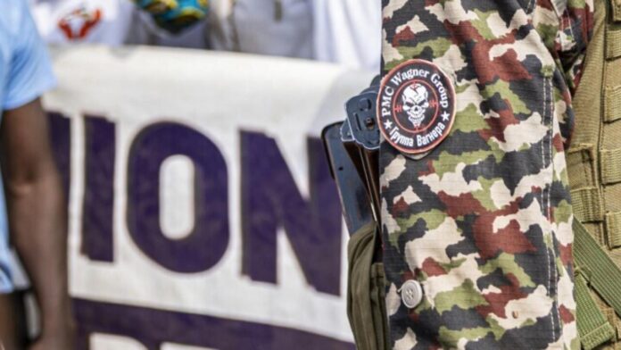 Logo du massé aventurier particulier Wagner sur l’terbe d’un guibole des forces armées de la État centrafricaine, le 1ᵉʳ ventôse 2025 (Orné d’célébrité) AFP – PATRICK MEINHARDT